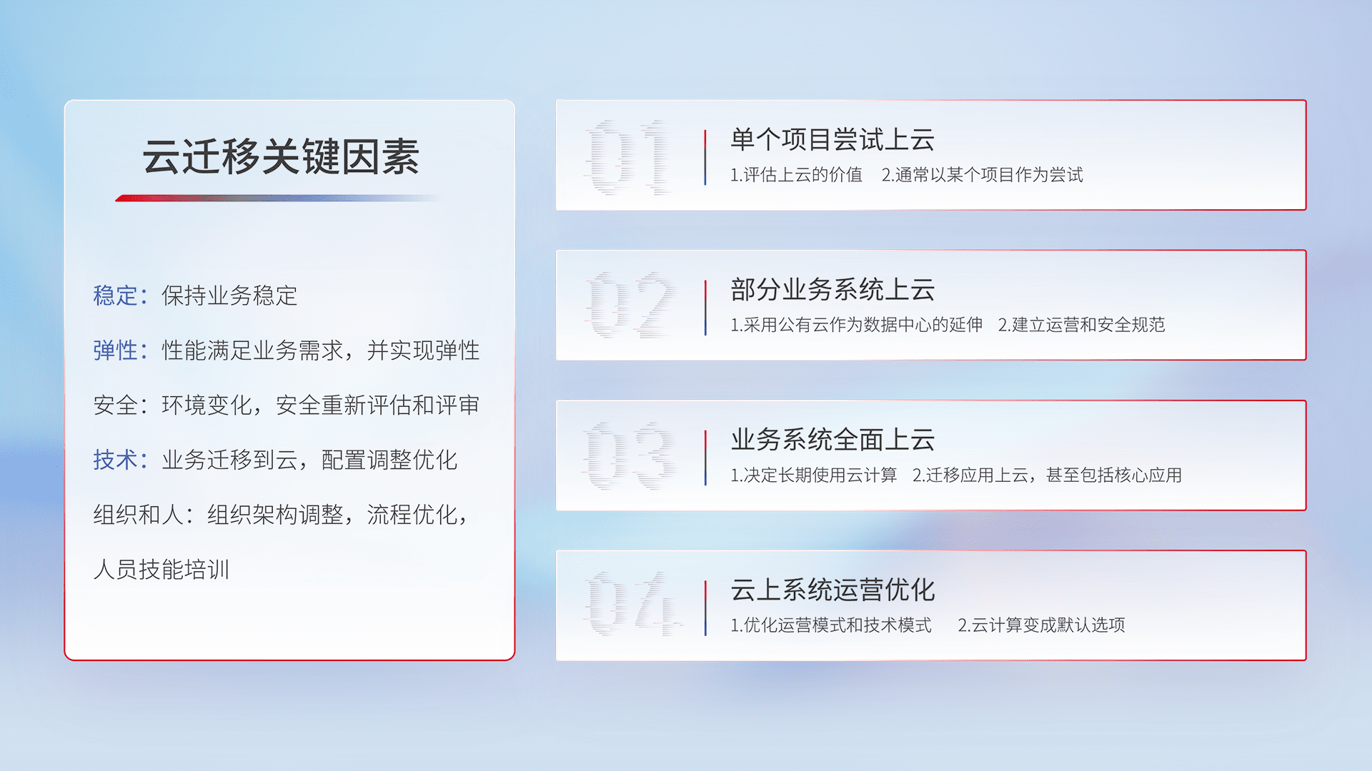 结合实际业务,,,从规划设计、、云平台选型、、、云原生改造、、数据迁移、、、集成交付,,迁移全过程为客户识别最佳上云路径,,,做好风险识别管理,,,设计网络架构、、身份权限、、、、安全审计合规、、、、操作审计、、、日志审计、、监控告警策略、、多站点容灾设计等,,,,对云上基础设施进行整体规划,,,,提升IT治理水平,,,以满足弹性、、、、高可用、、、高性能的需求。。。