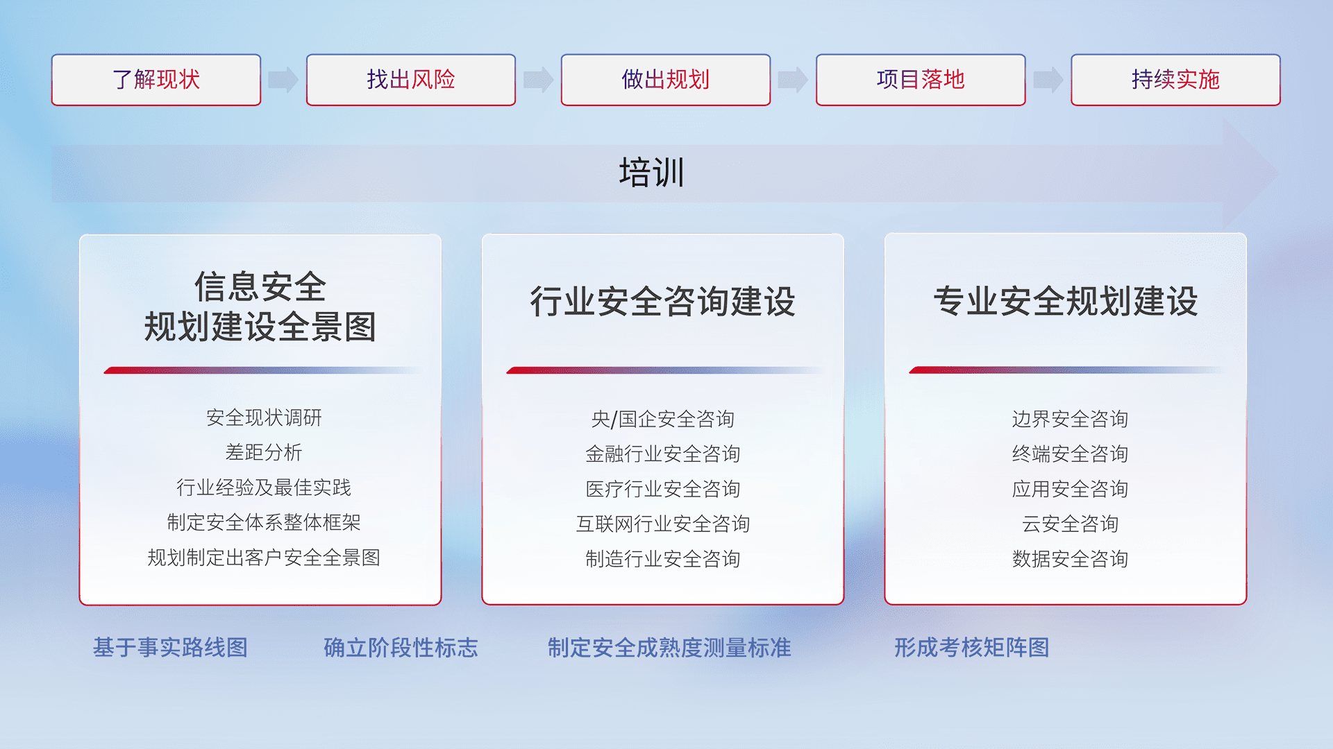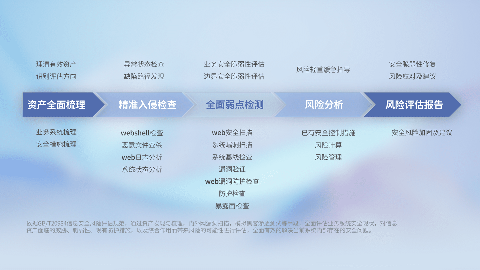 针对客户行业特性,,,,以专业的安全服务+多厂商联合解决方案提供专属的一站式安全管理服务,,,,帮助客户全面感知网络空间威胁,,基于识别、、、检测、、、分析、、、防护、、、监测、、、响应的服务理论模型,,从方案咨询、、、集成交付、、、、评估验证、、优化加固、、运维运营,,,,致力于为客户提供完整的闭环管理式安全服务。。。以实战经验为客户打造高抵御风险的安全体系,,帮助客户发现威胁、、、、对抗威胁、、、处置威胁,,,不断积累安全对抗能力,,持续保障数字化安全。。。。